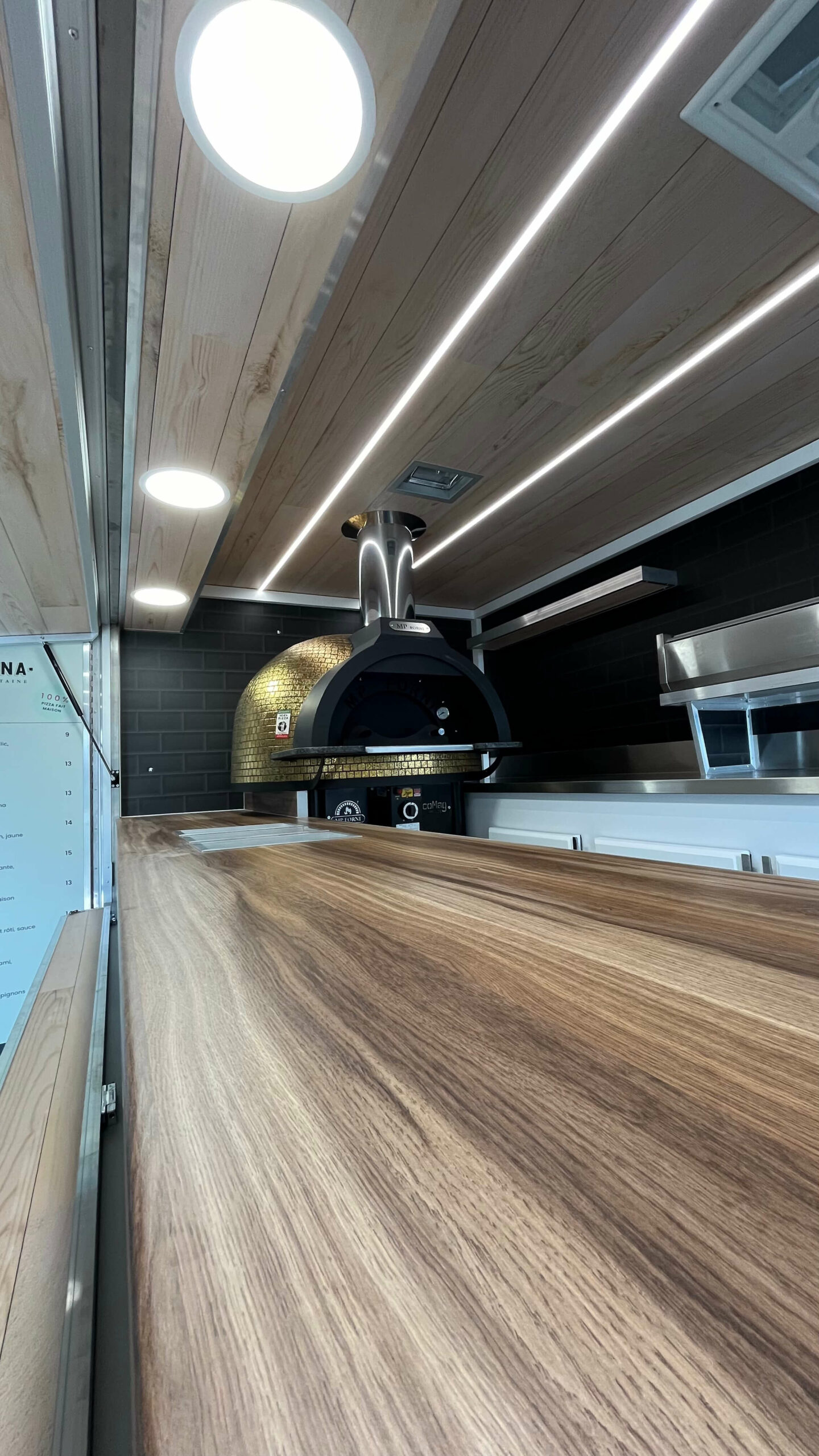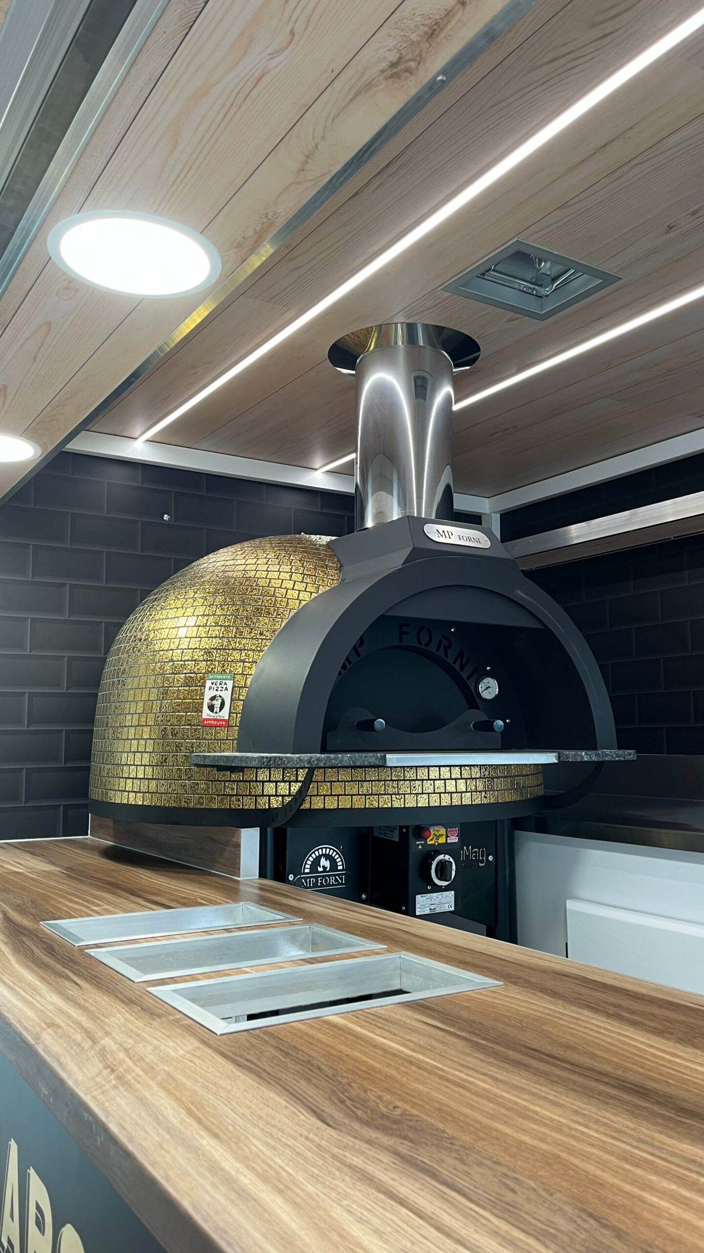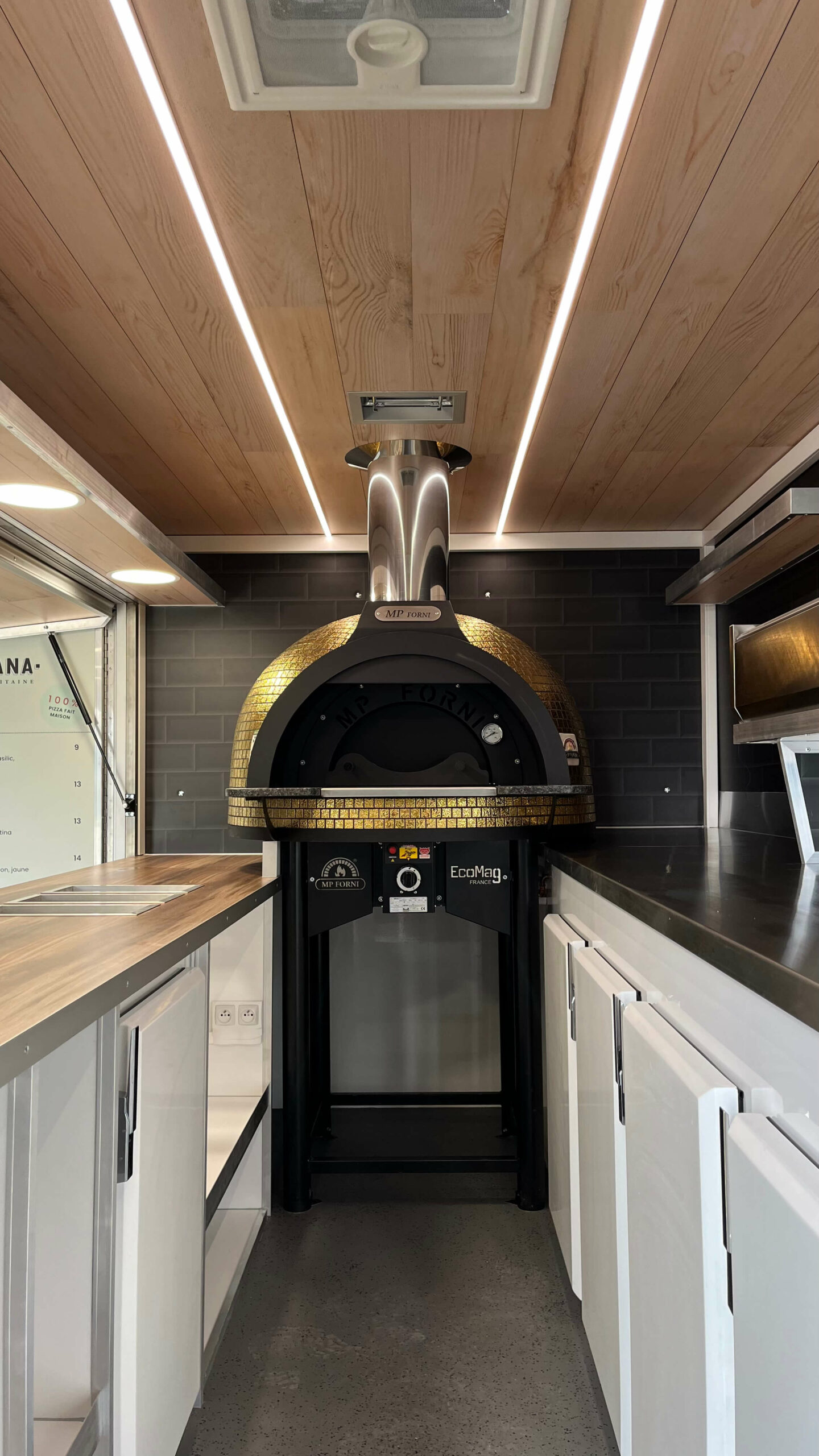Équipements froid & cuisson Four Napolitain mixte gaz/bois (3/4 pizzas, mosaïque personnalisable), saladette réfrigérée 7 bacs GN1/3 (1600x395mm), groupe frigorifique monoblock tropicalisé 4m³ à 0°C (L556mm l420 h683), alimentation du froid en roulant avec convertisseur et inverseur de source.