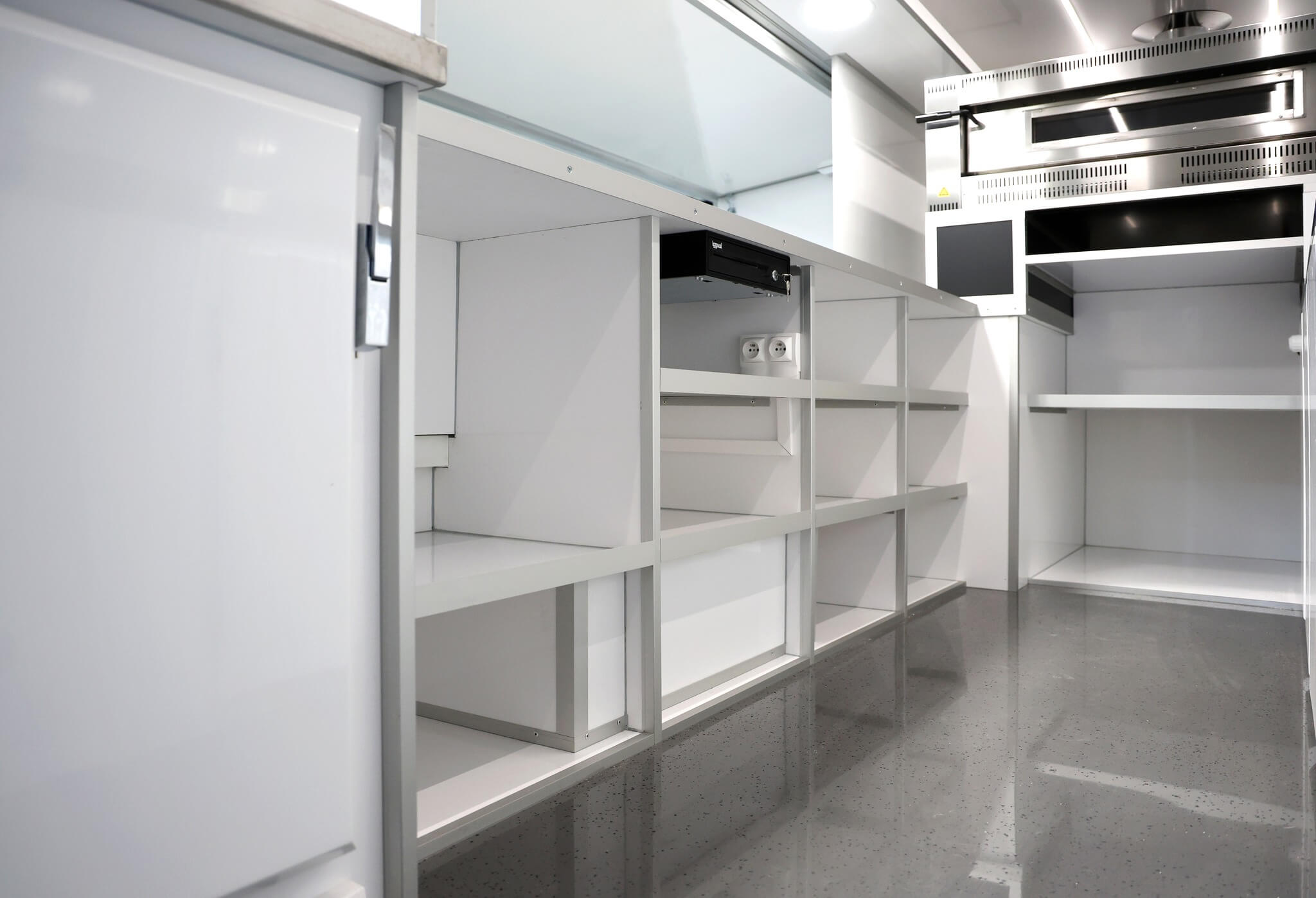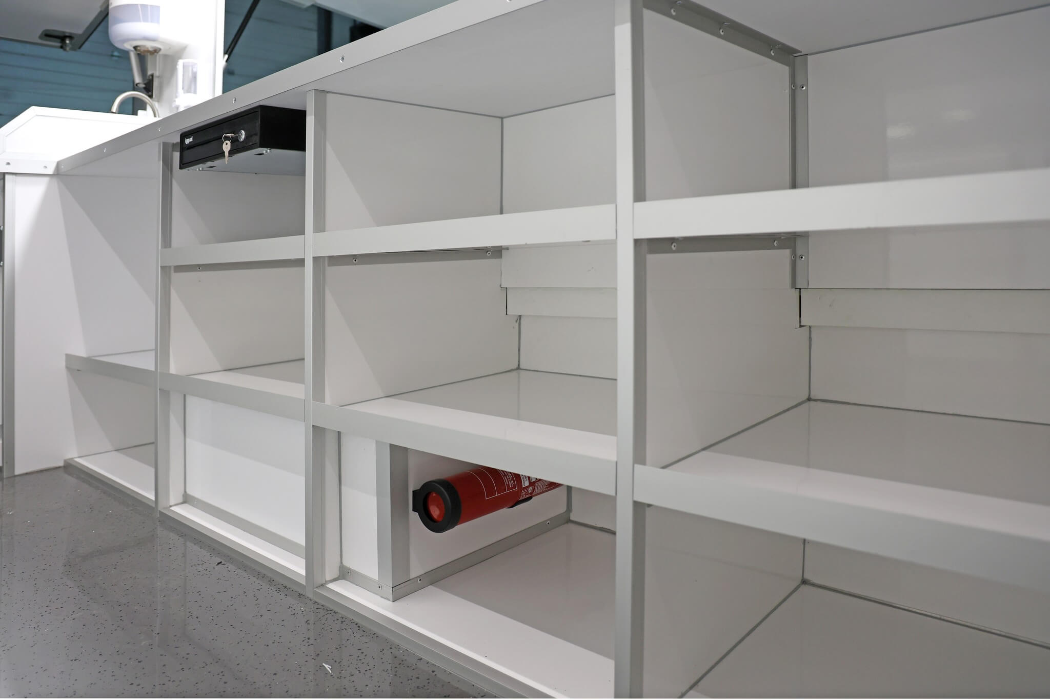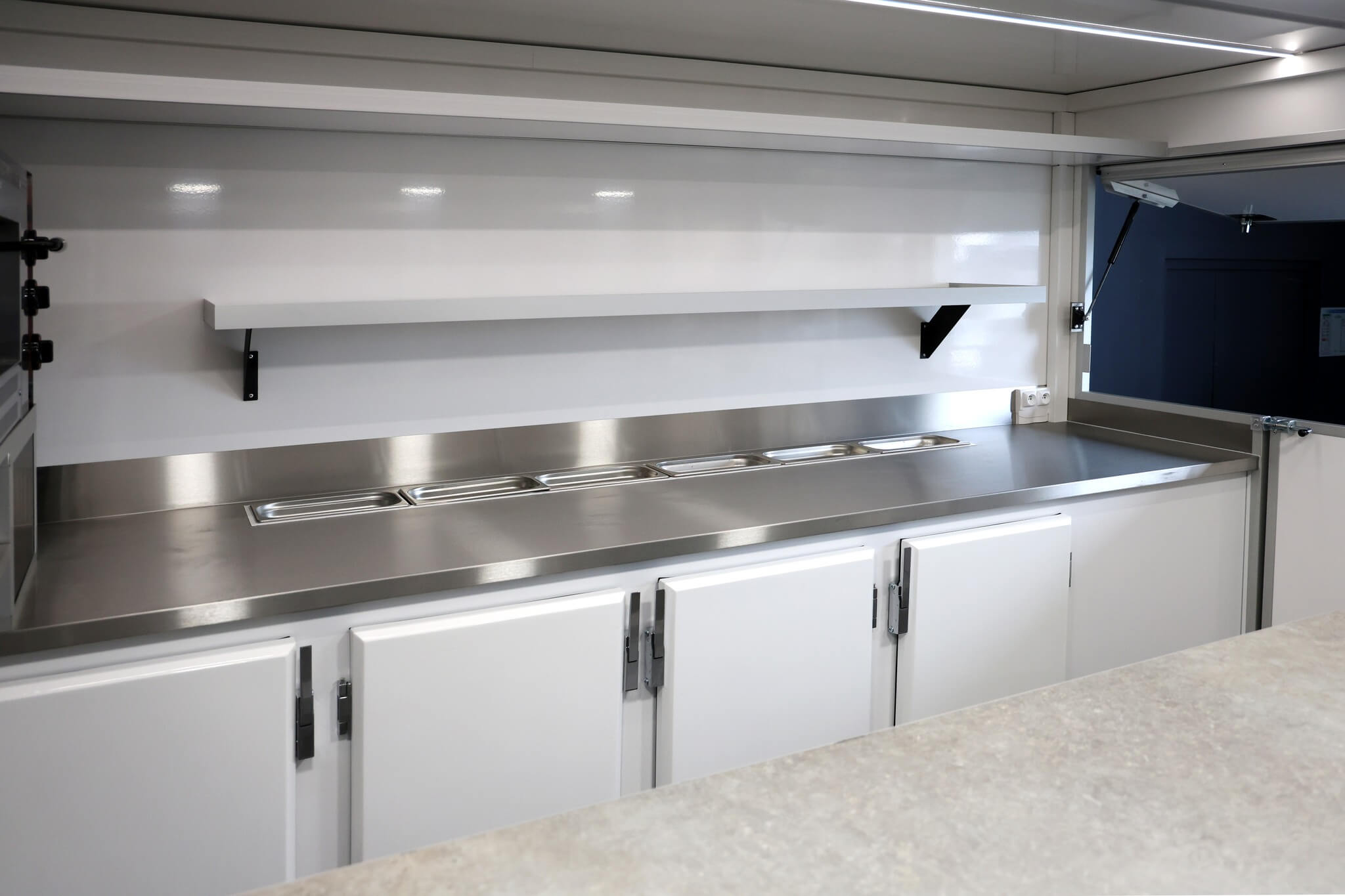 Comptoir & Espace de travail Comptoir de vente avec rangements, tiroir-caisse sous plan de service, tablette repose-sac rabattable, étagère de pavillon avec luminaires personnalisables, espace cuisson avec protection inox et thermique, marche-pied rétractable.