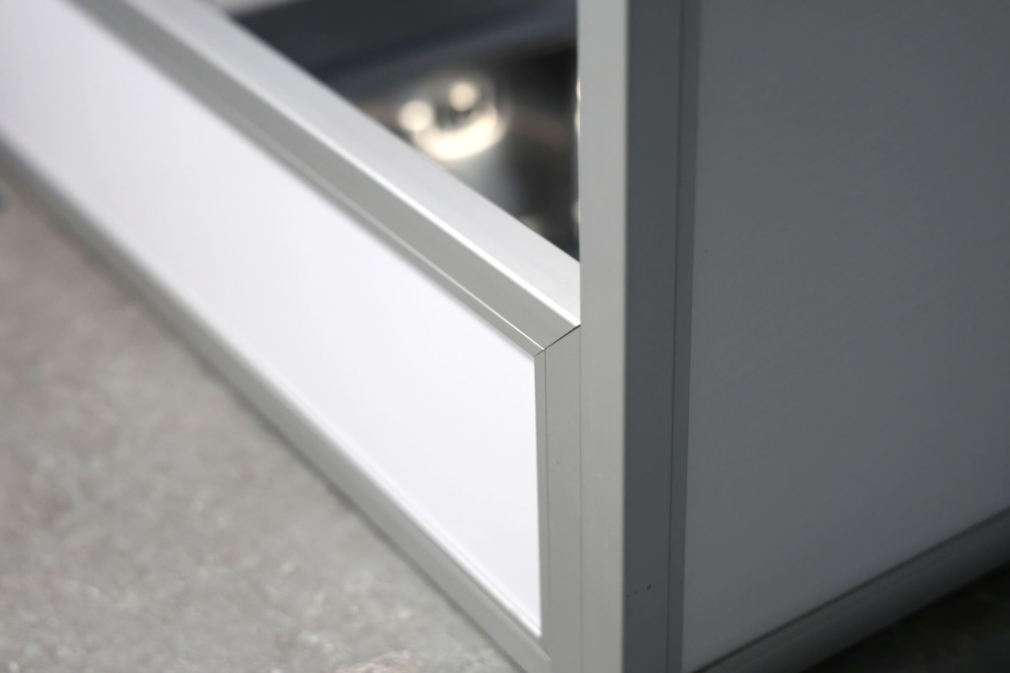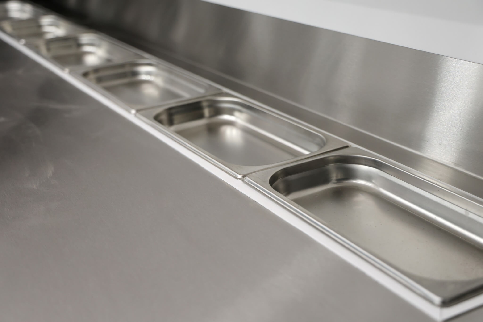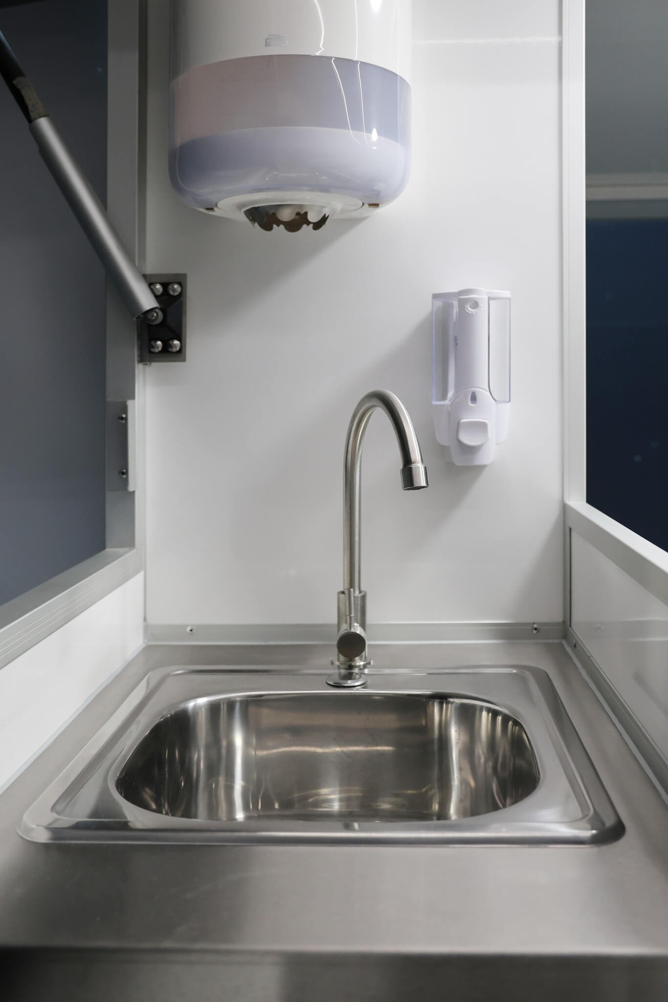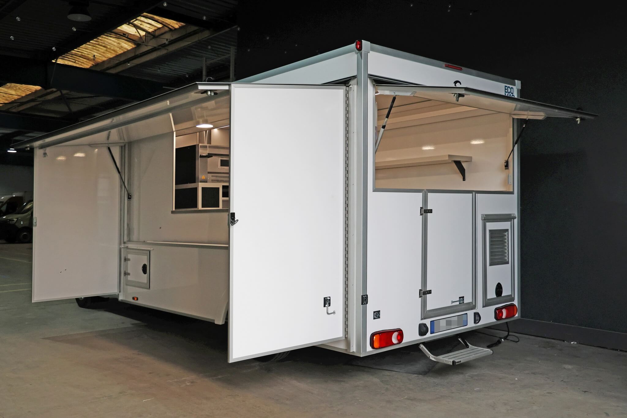 Comptoir & Espace de travail Comptoir de vente avec rangements, tiroir-caisse sous plan de service, tablette repose-sac rabattable, étagère de pavillon avec luminaires personnalisables, espace cuisson avec protection inox et thermique, marche-pied rétractable.