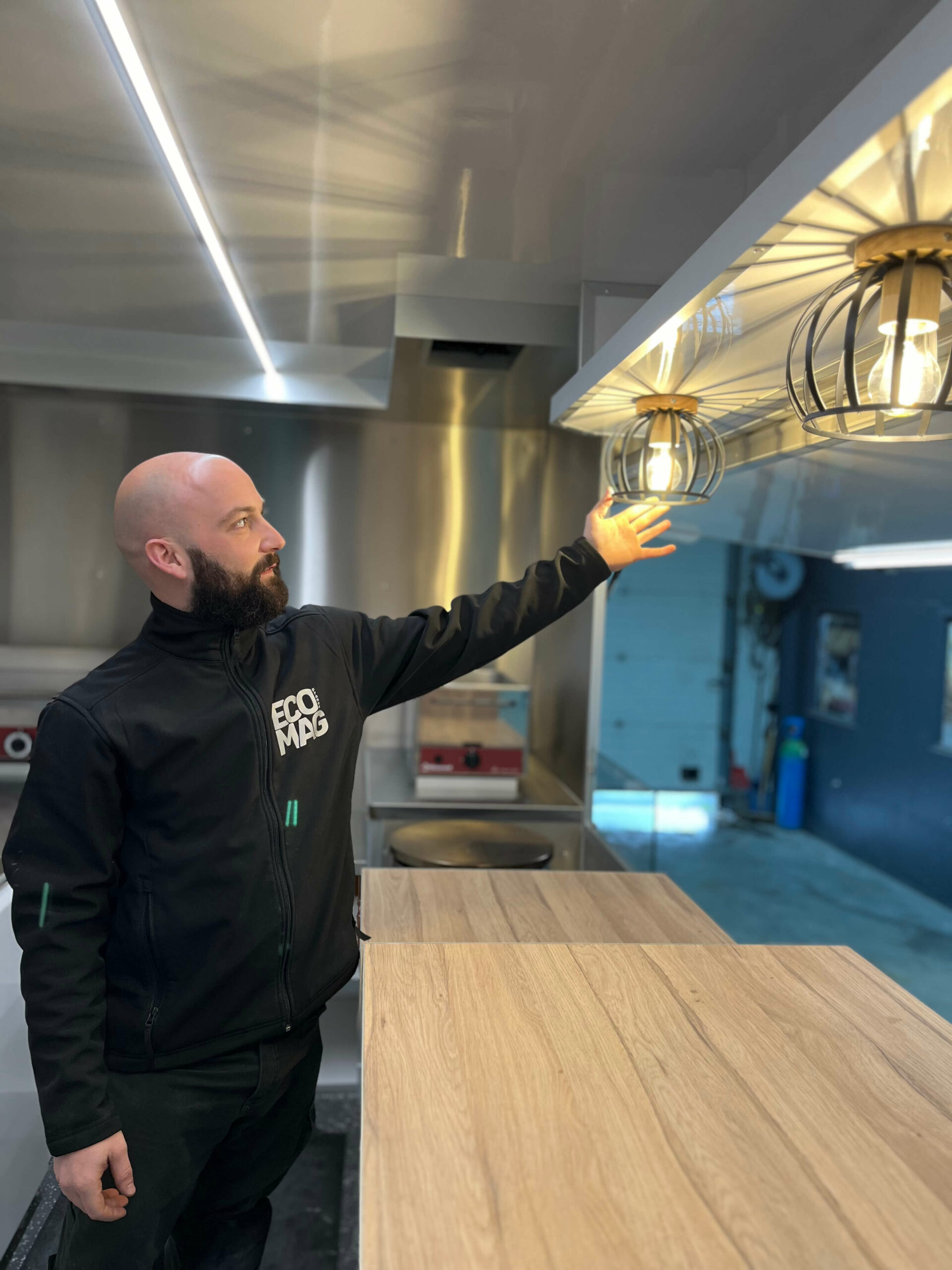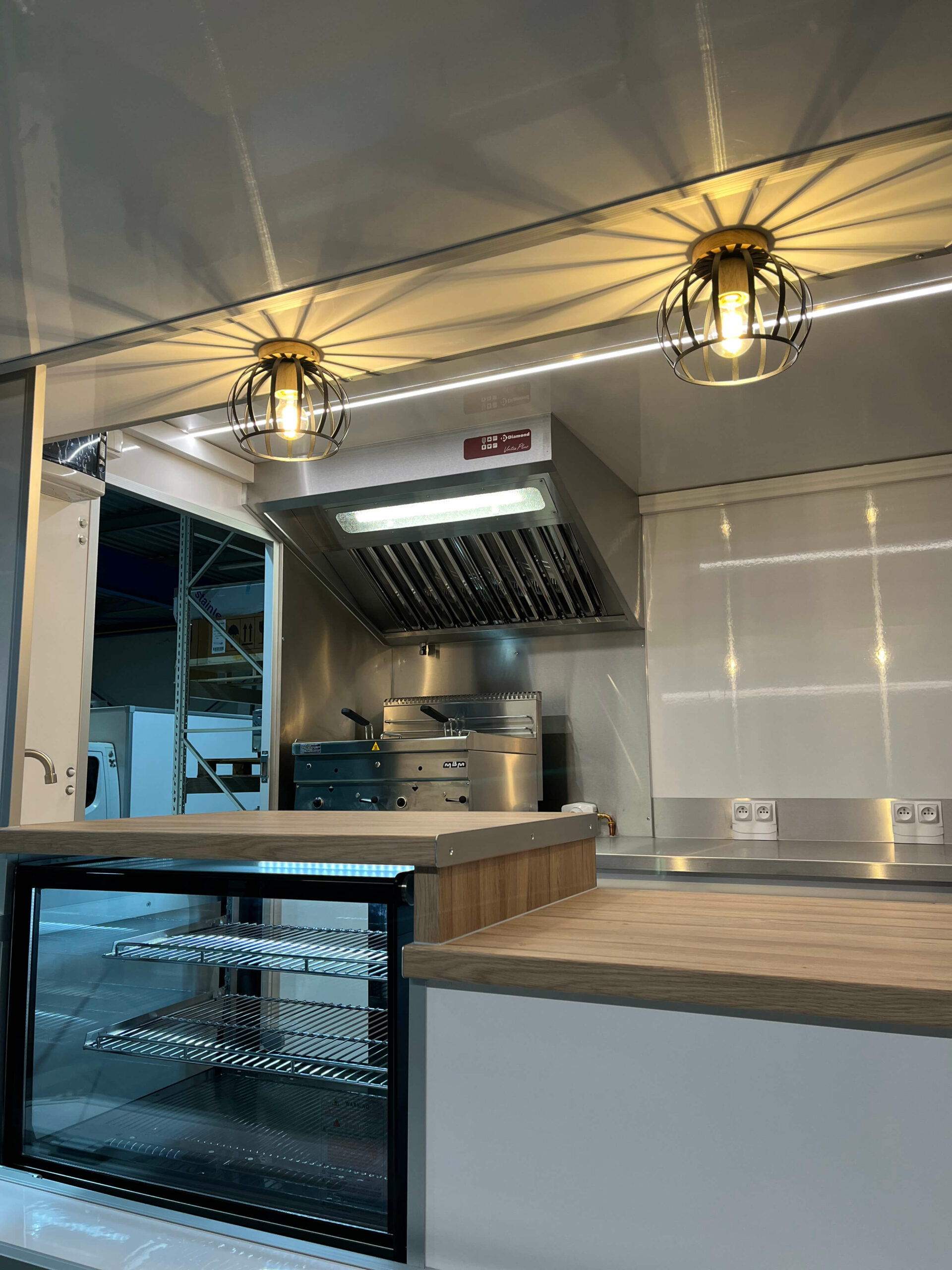 Comptoir & Espace de travail Comptoir de vente, tablette repose sac rabattable, étagère de pavillon, espace cuisson avec protection inox et thermique, espace préparation avec meuble réfrigéré sous plan de travail, étagères à définir avec le client.