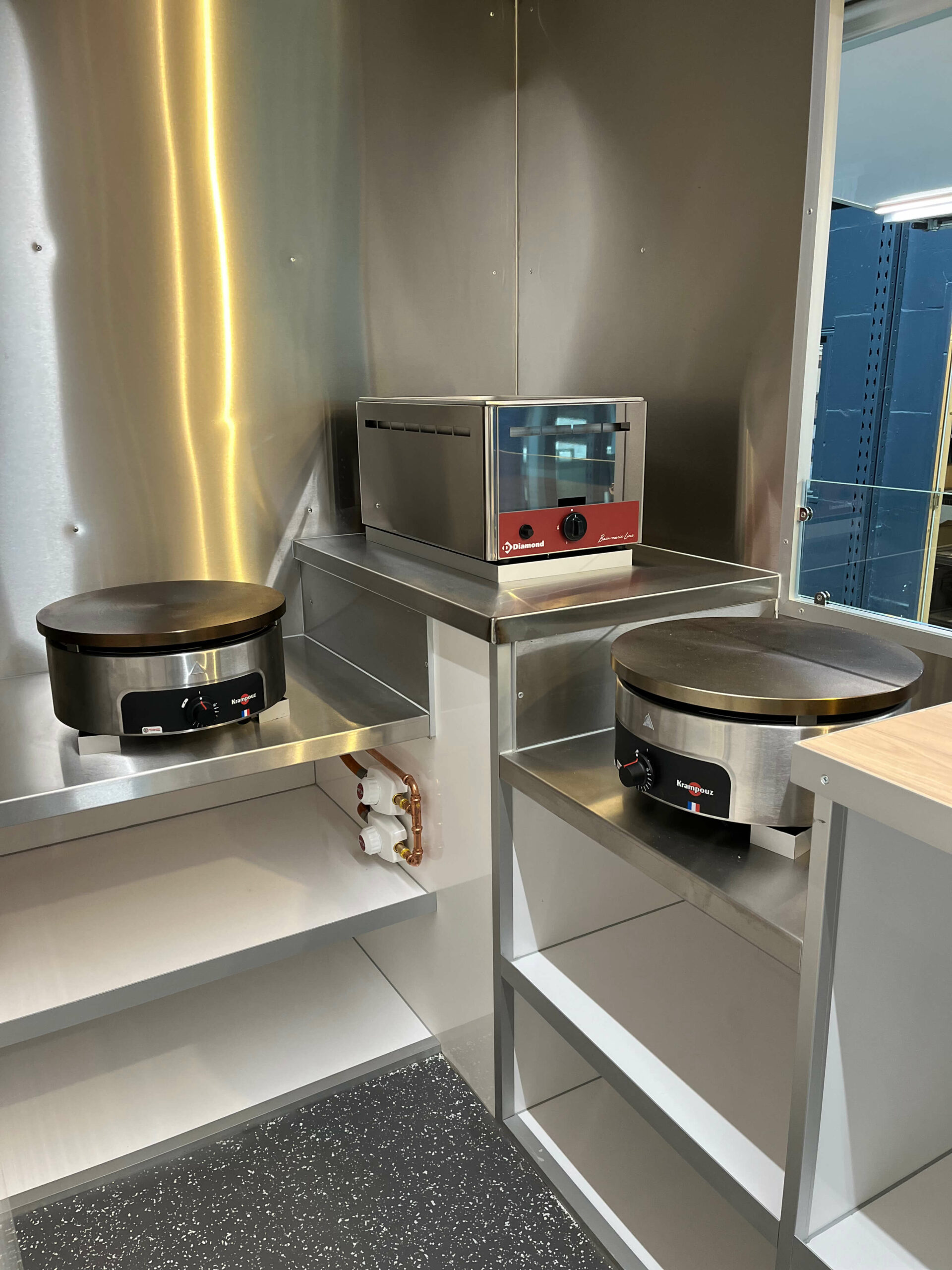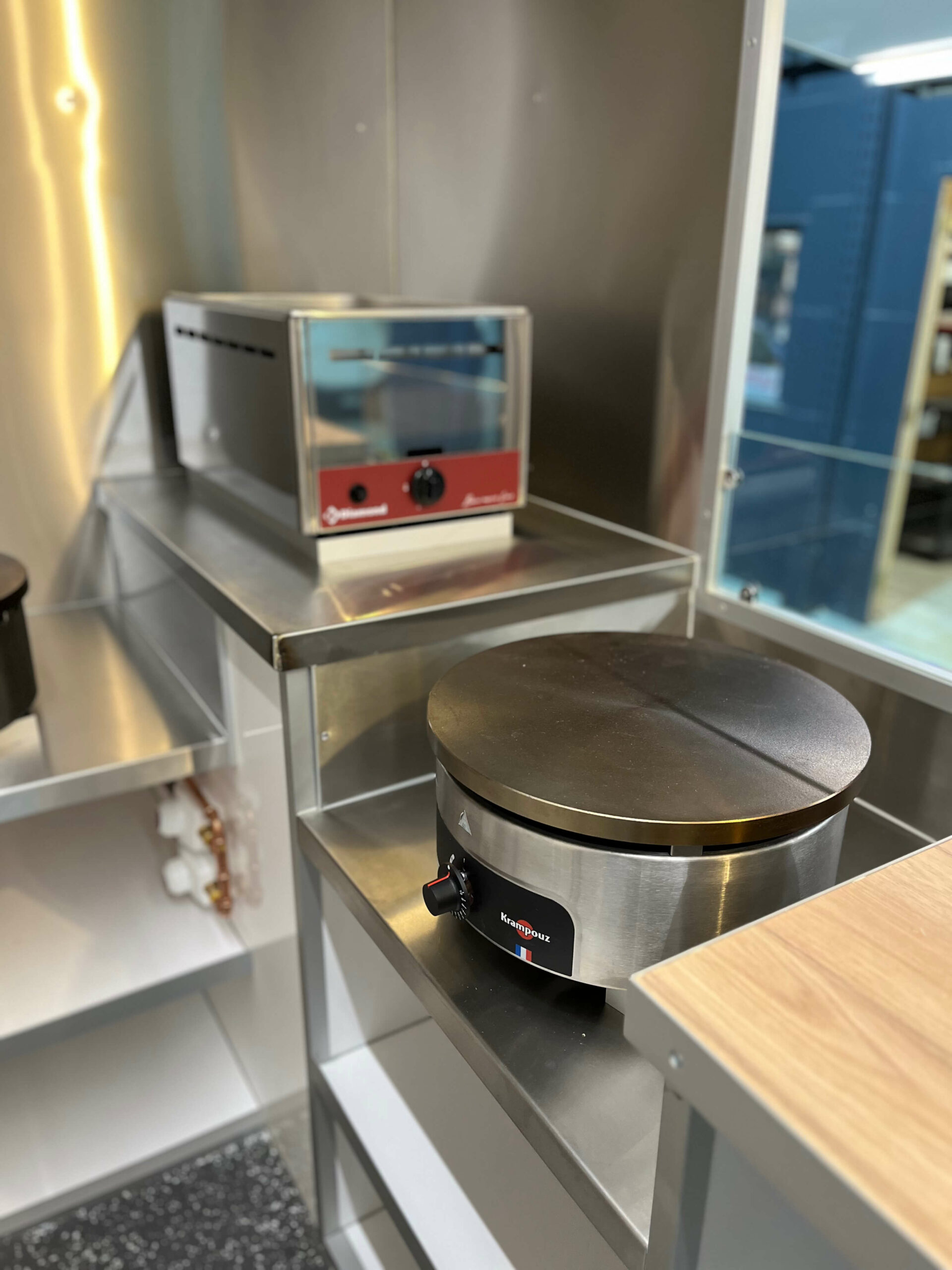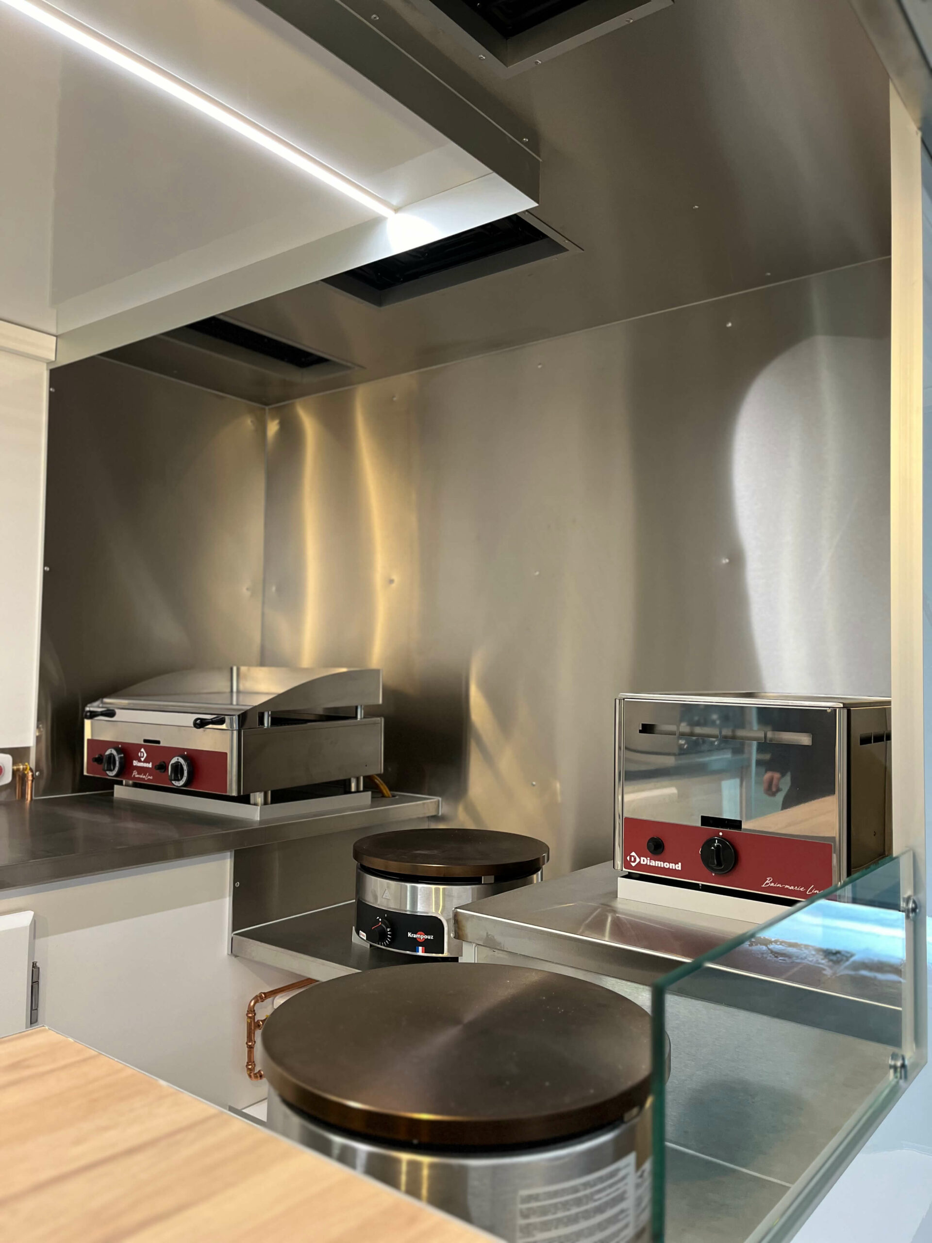Équipements Cuisson & froid Crépière Krampouz gaz (diamètre 40cm), vitrage protection verre trempé, plancha gaz 2 feux 620x510mm, hotte aspirante 1m, bain-marie gaz GN1/1, friteuse gaz 2x8L avec 2 paniers, groupe frigorifique tropicalisé 4m³ à 0°C (L556mm l420 h683), vitrine réfrigérée 120L (700x560xh680), chapeau clapet évacuation fumées, caméra de recul.