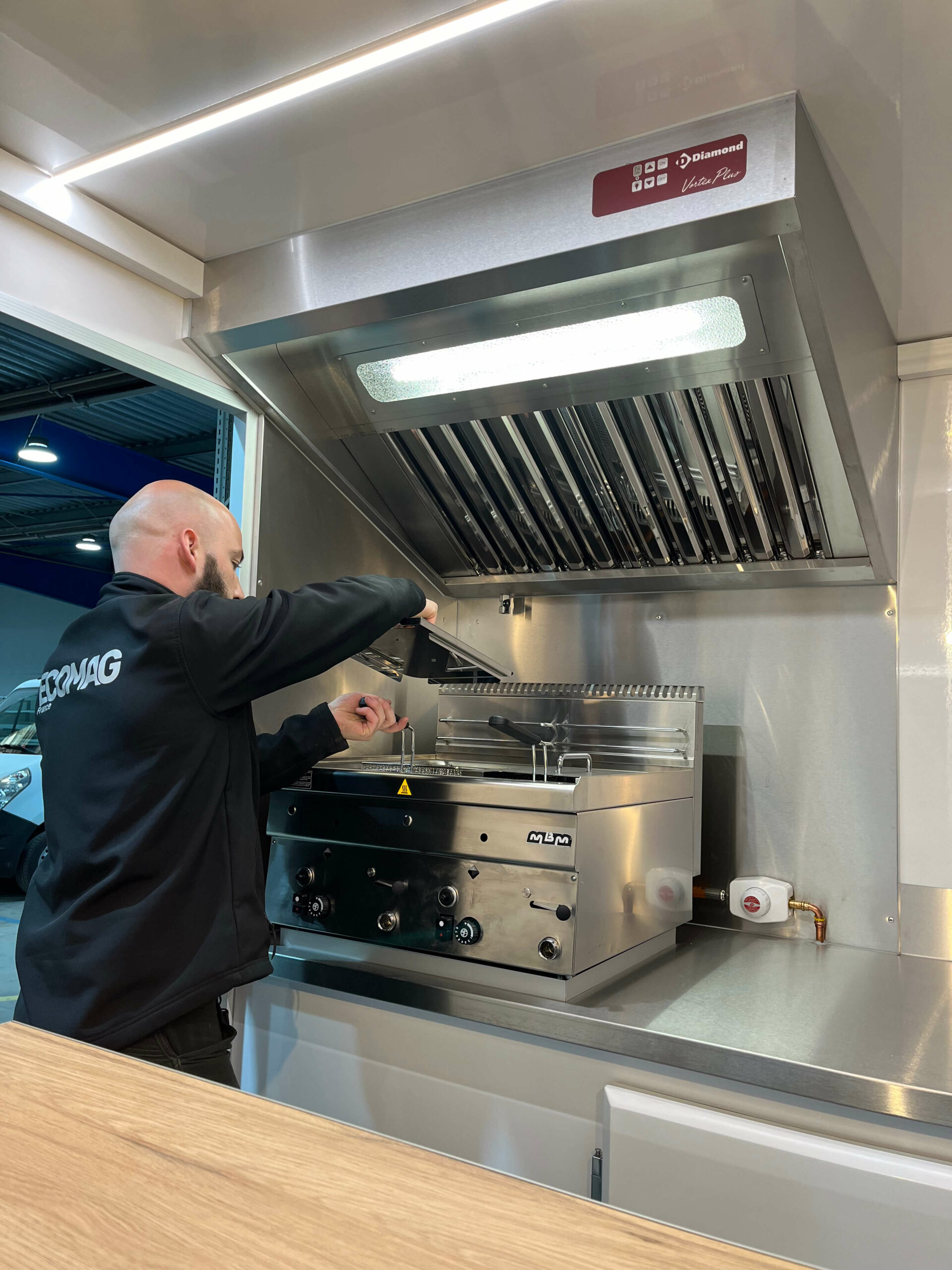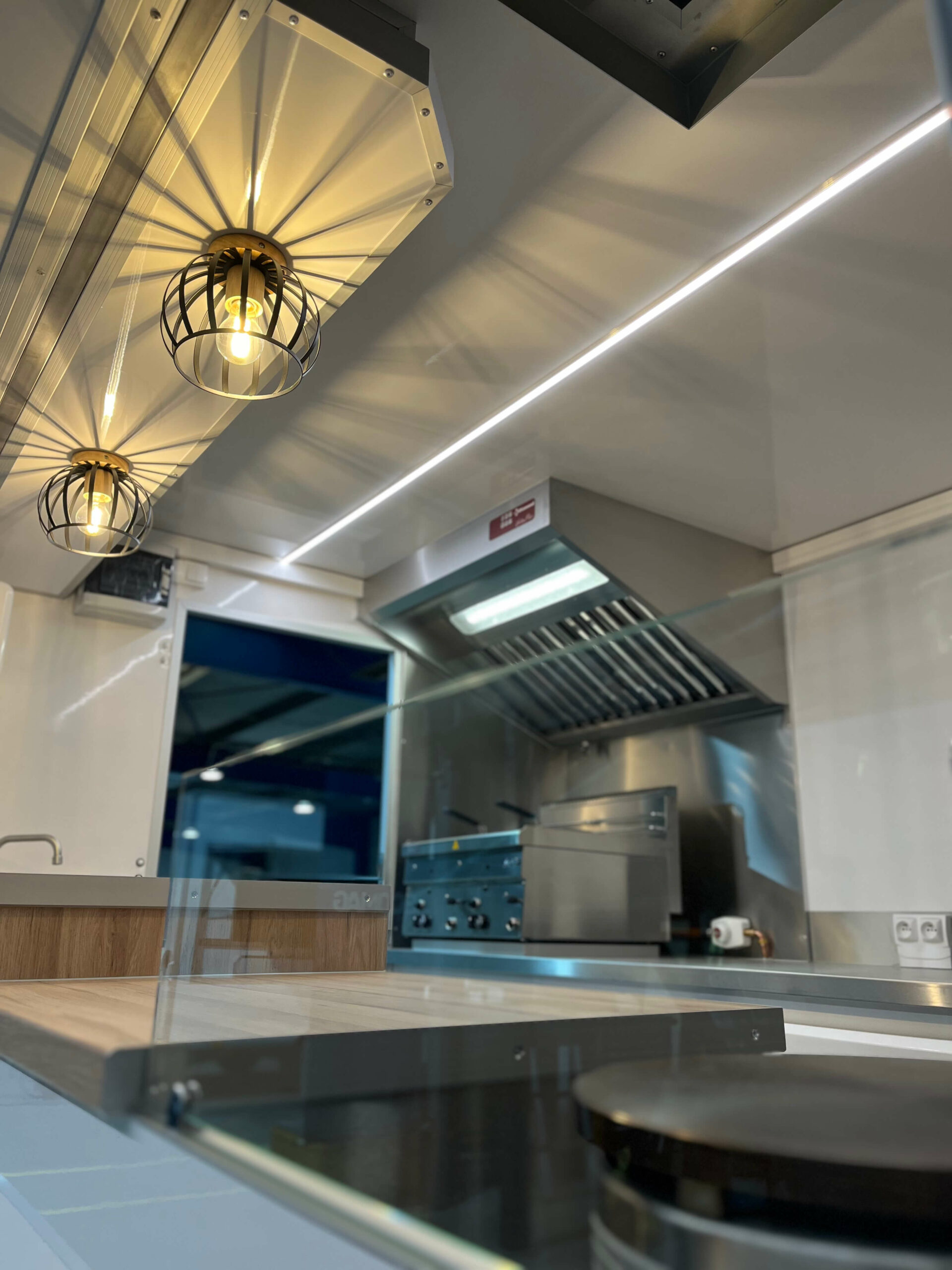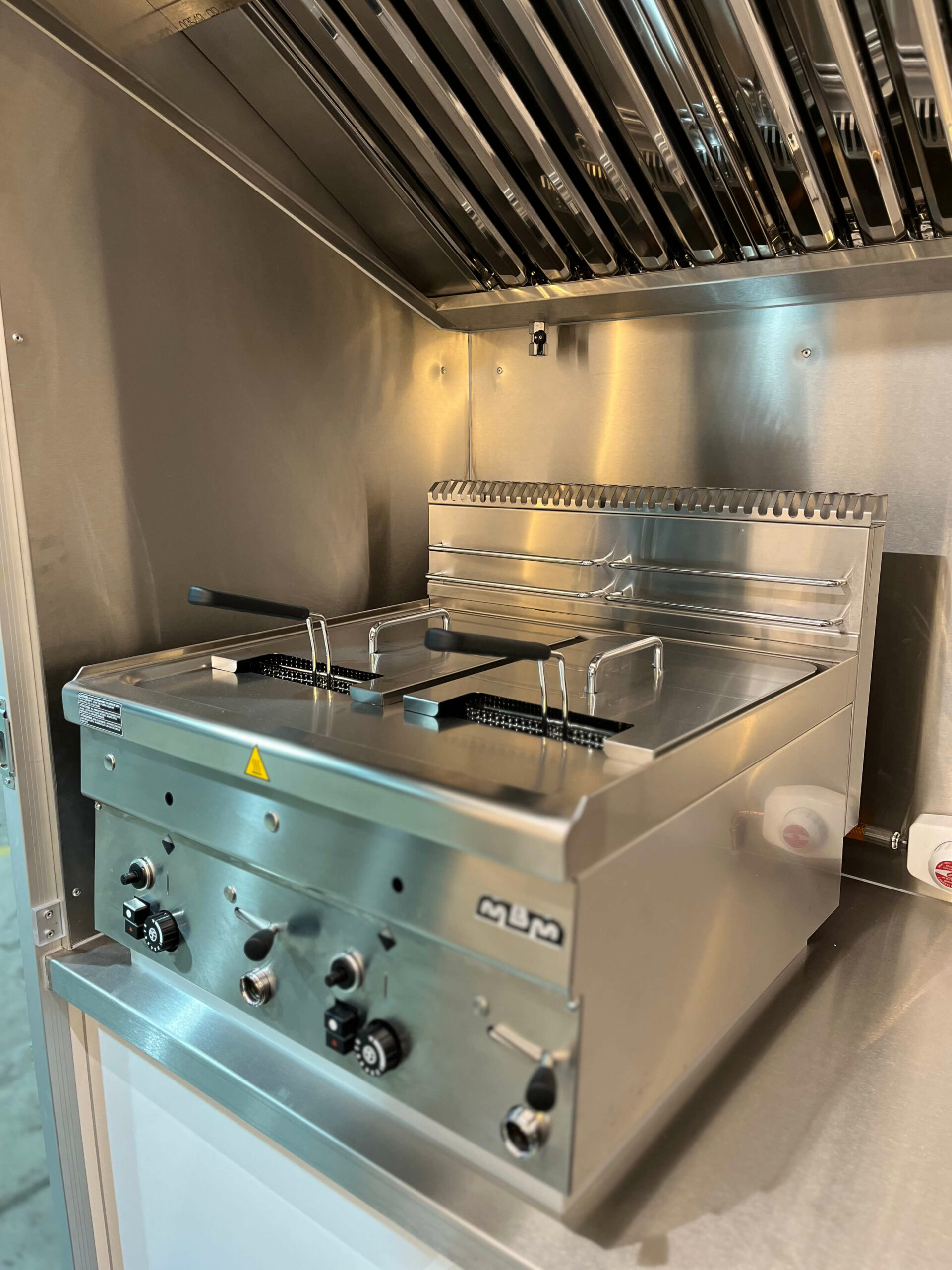 Équipements Cuisson & froid Crépière Krampouz gaz (diamètre 40cm), vitrage protection verre trempé, plancha gaz 2 feux 620x510mm, hotte aspirante 1m, bain-marie gaz GN1/1, friteuse gaz 2x8L avec 2 paniers, groupe frigorifique tropicalisé 4m³ à 0°C (L556mm l420 h683), vitrine réfrigérée 120L (700x560xh680), chapeau clapet évacuation fumées, caméra de recul.