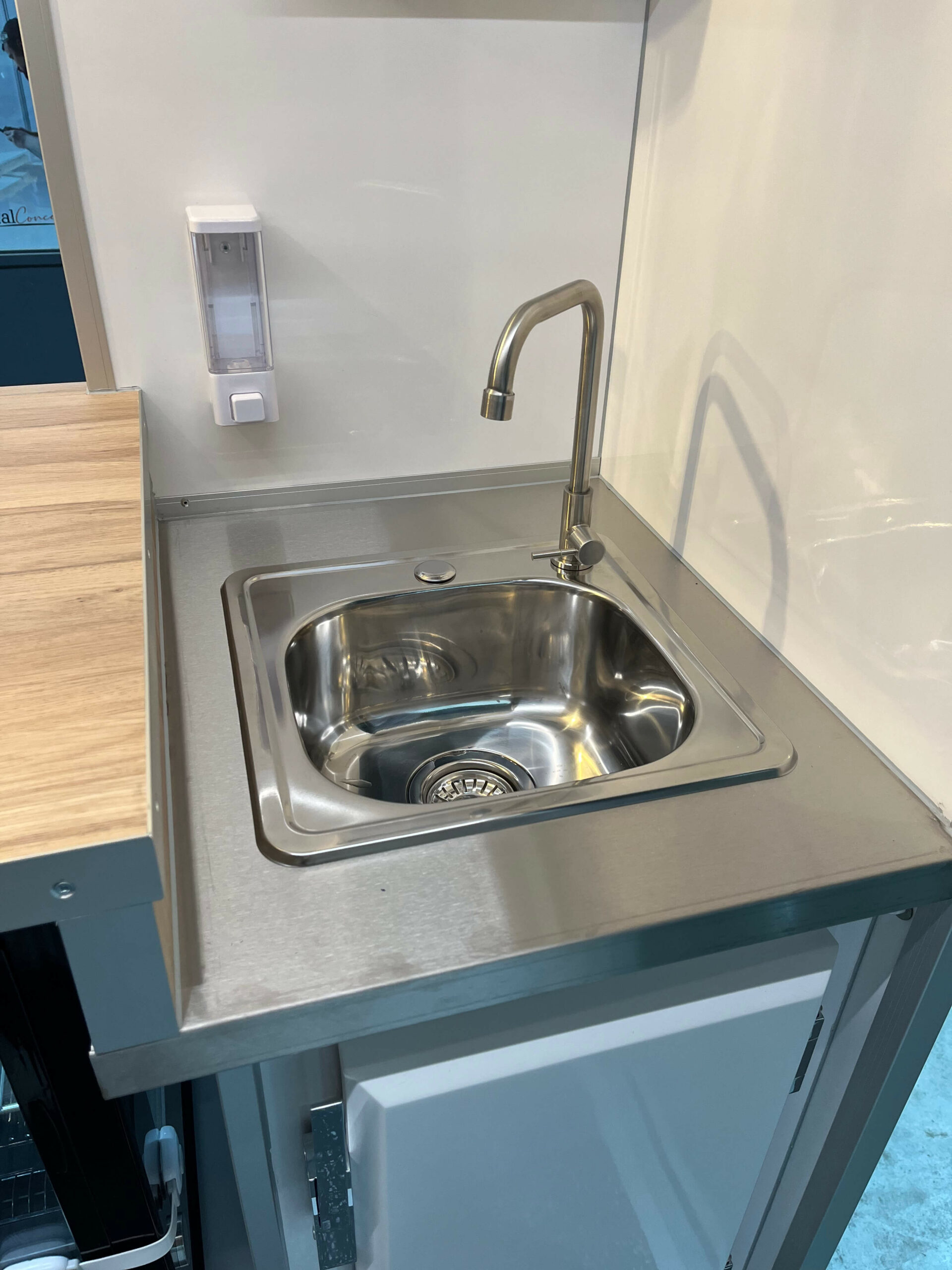Stockage & Étagères Lave-mains intégré avec réserve d’eau 13L (pompe à pied électrique), dérouleur essuie-tout, distributeur à savon norme alimentaire, LEDs sous hayon, demi-porte arrière.