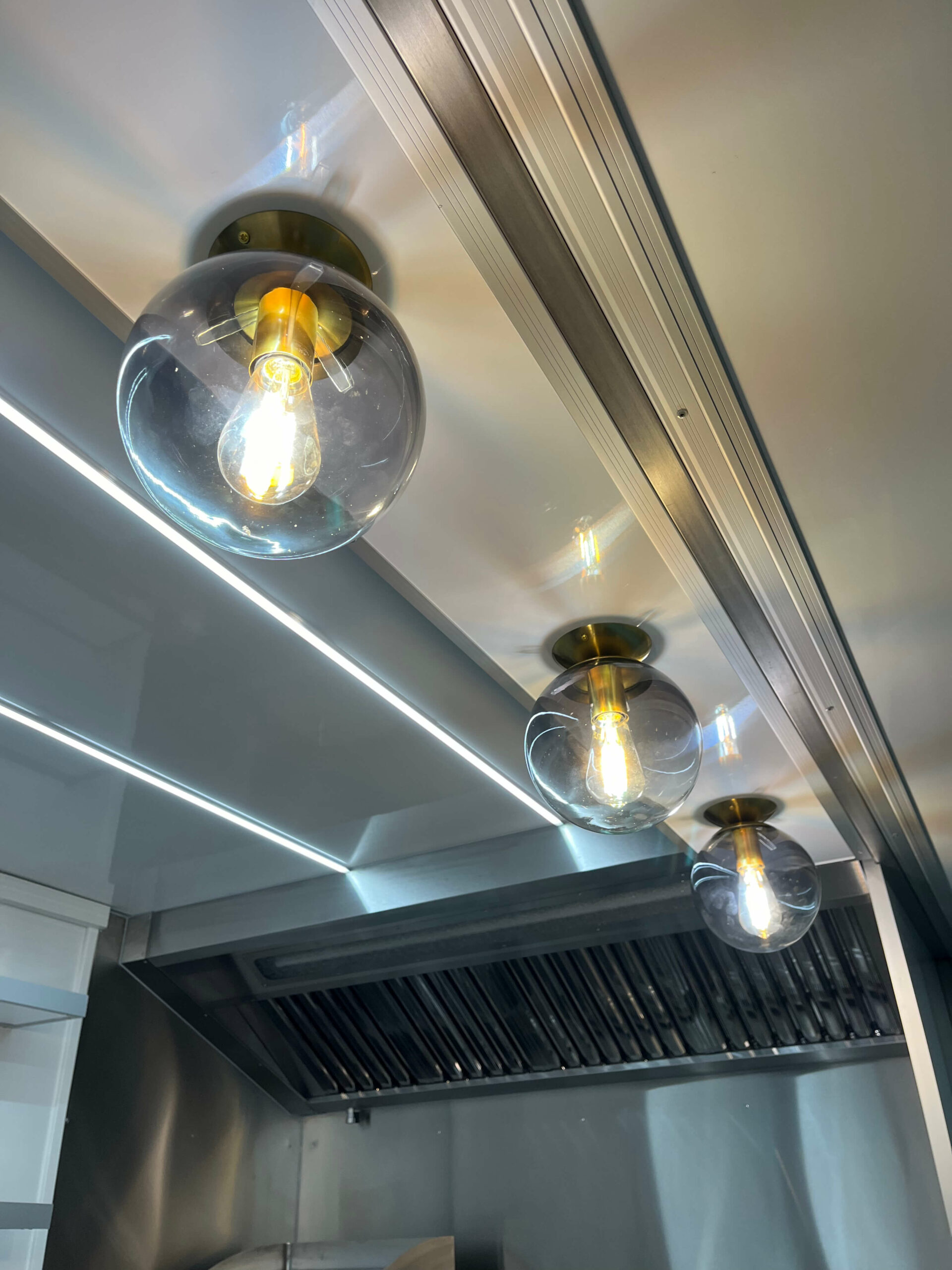 Comptoir & Espace de travail Comptoir de vente avec rangements, tablette repose sac rabattable, étagère de pavillon avec luminaires personnalisables, espace cuisson avec protection inox et thermique, espace préparation inox avec chambre froide sous plan de travail.