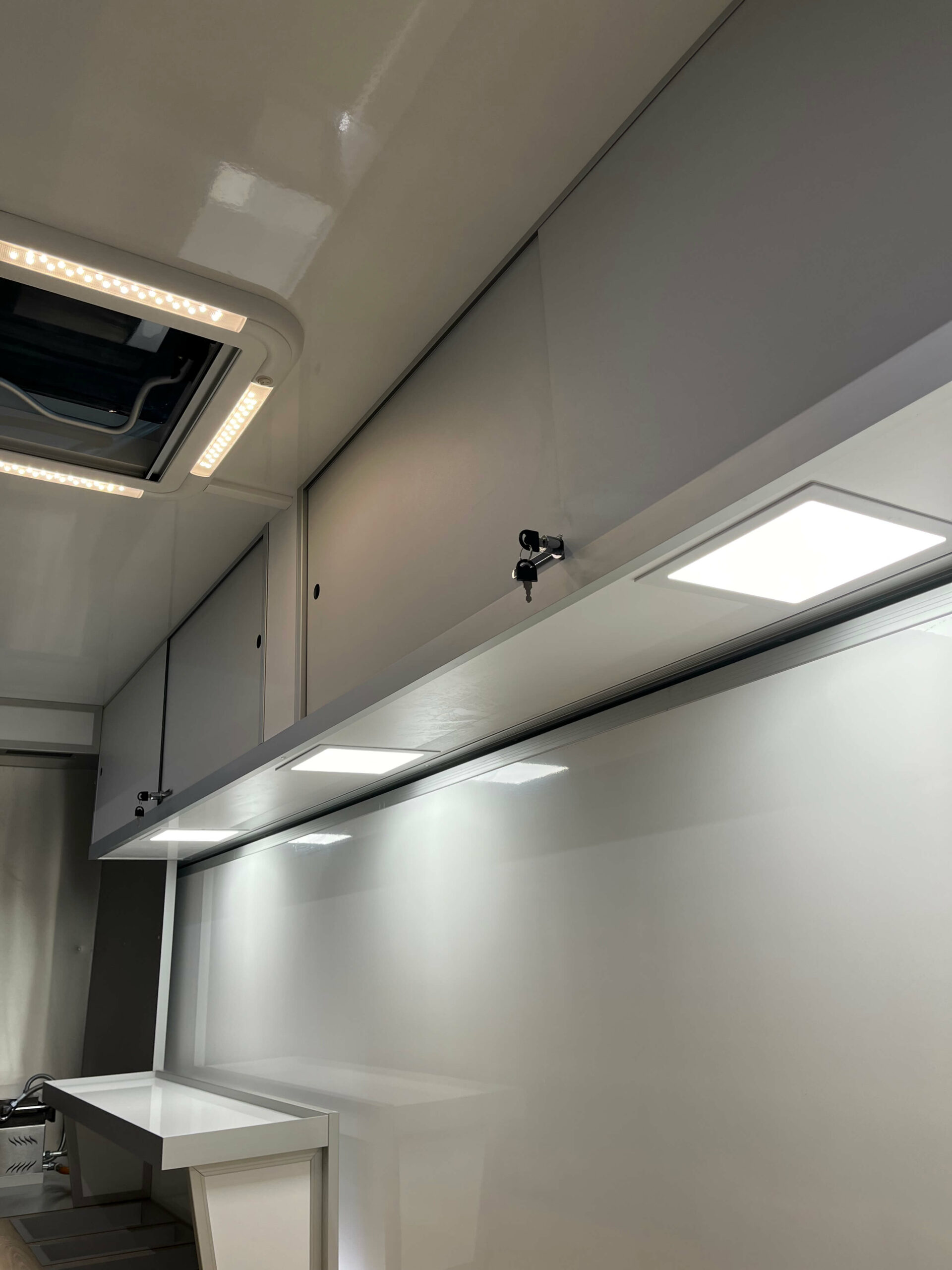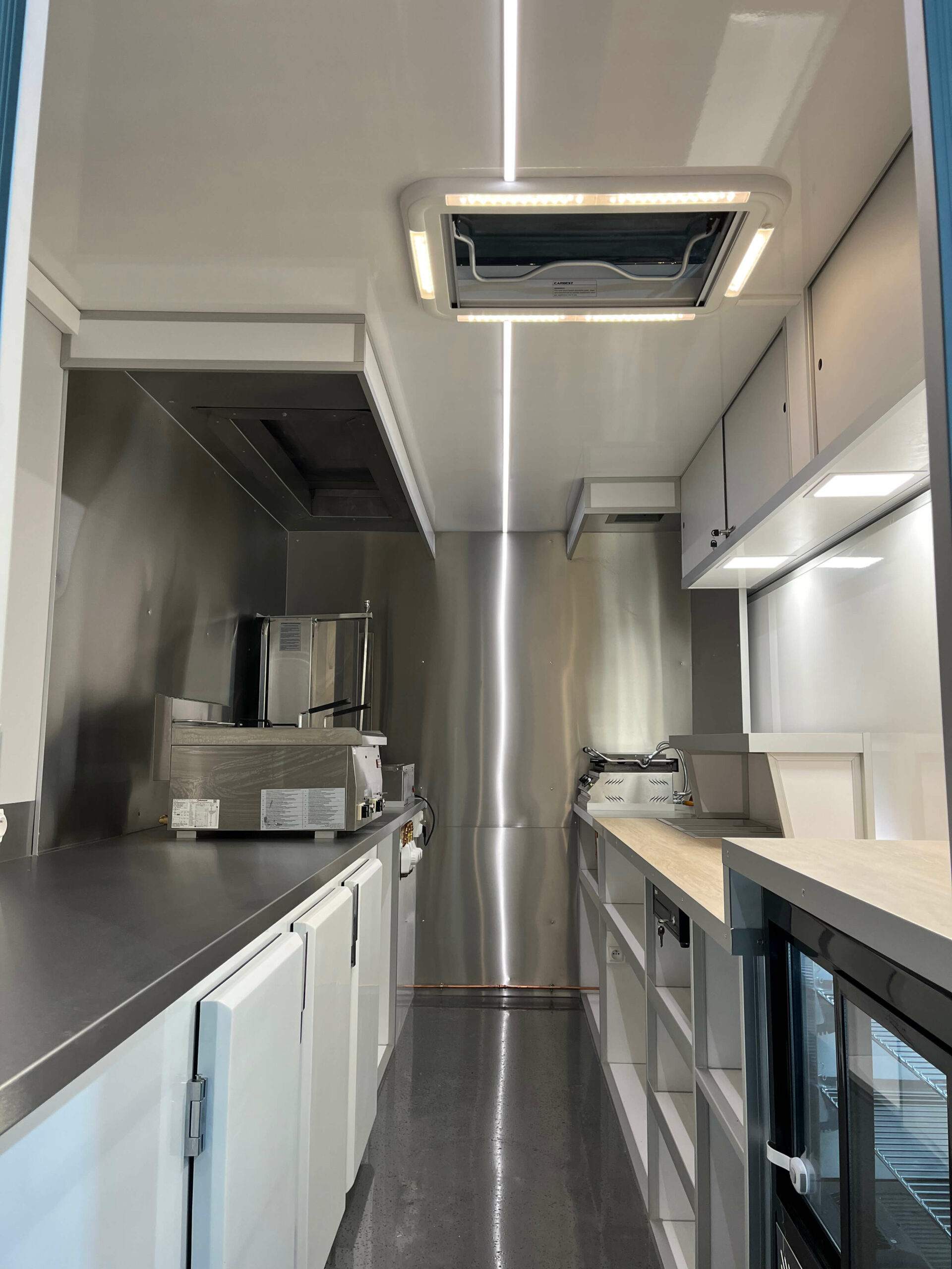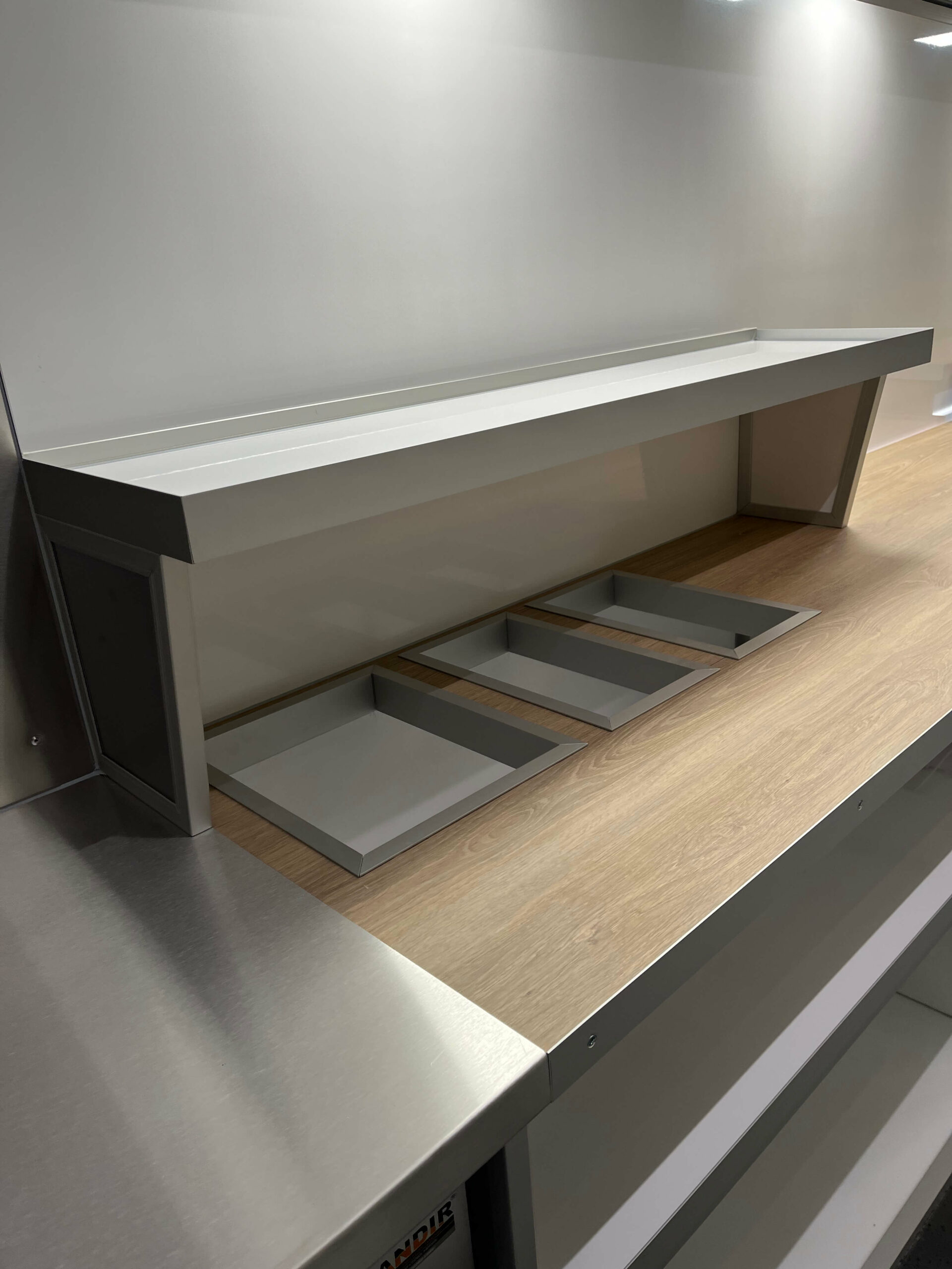 Comptoir & Espace de travail Comptoir de vente avec rangements, étagère de pavillon avec luminaires personnalisables, espace cuisson avec protection inox et thermique, espace préparation inox avec chambre froide sous plan de travail, marche-pied rétractable.